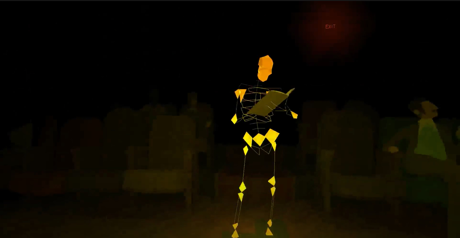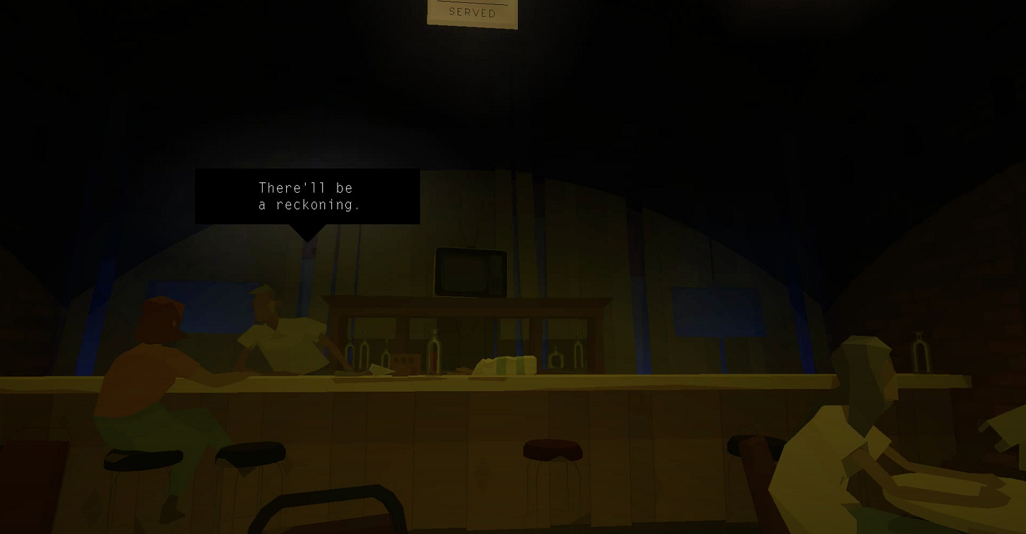 Kentucky Route Zero’s intermission between Acts II and III is a short play titled “The Entertainment,” whose protagonist is a desperate bartender going out of business. His regulars have refused to pay their tabs for so long that he is forced to make a desperate move: he sells their unpaid tabs to the mysterious Hard Times Distillery to collect, who use debt itself in their bourbon’s aging process. Once all those who have abused the bartender’s generosity over the years are present, a Mephistophelean figure from Hard Times arrives, and the play ends in darkness as they are made company thralls: