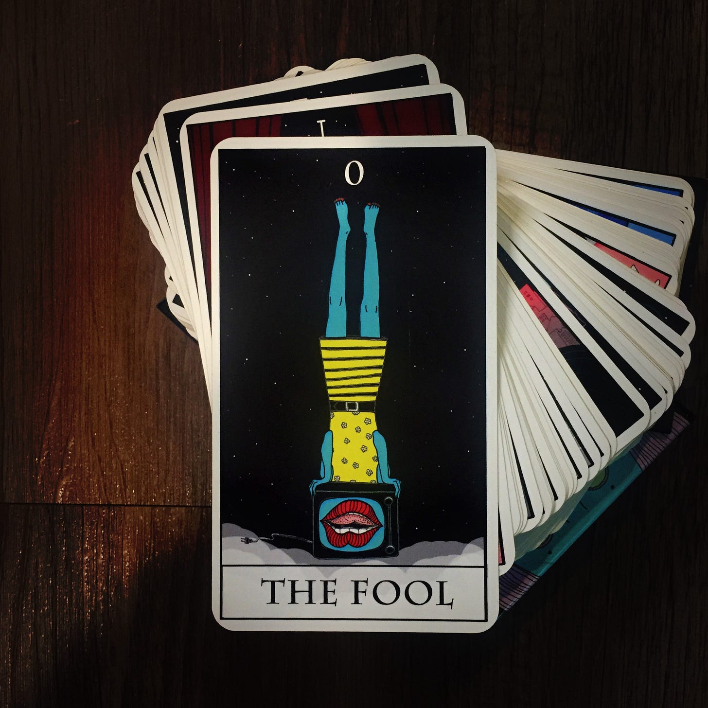 This image has been around. I’d be remiss not to note it’s also in the conspiracy theory darling Illuminati card game as “Empty Vee” (see also, MTV), furthering the empty-head/zero construction of the Fool:
